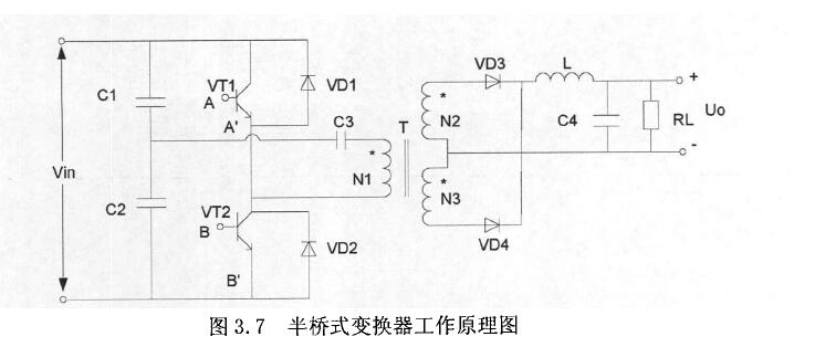半橋式一變換器的工作原理圖所示為半橋式變換器主電路,電容、組成變換器的一個橋臂,保證二,功率管、構成變換器的另一橋臂。隔直電容用來防止由于兩個開關管的特性差異而造成變壓器磁芯飽和,從而提高半橋逆變電路的抗不平衡能力。