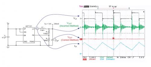 下圖描述了采用兩個(gè)不同的測(cè)試方法得到的Vout波形。電源電路是一個(gè)BUCK轉(zhuǎn)換電路(AAT1121),工作在1.5MHz的開(kāi)關(guān)頻率,輸出電壓為1.8V/250mA。示波器采用全帶寬測(cè)試。可以看到伴隨著PWM開(kāi)關(guān),在綠色的trace2有一個(gè)很高的噪音以及振鈴,但是trace3上卻沒(méi)有明顯的噪聲。通過(guò)對(duì)比可以看到,測(cè)試方法的選擇對(duì)結(jié)果的準(zhǔn)確性很關(guān)鍵。