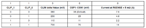 對(duì)4開(kāi)關(guān)同步整流的升降壓控制在輕載模式、重載到輕載的轉(zhuǎn)換過(guò)程、輸出過(guò)壓保護(hù)、輸出從高電壓向低電壓調(diào)整過(guò)程中會(huì)有反向電流產(chǎn)生。CSP2/CSN2用于反向電流的檢測(cè),當(dāng)反向電流超過(guò)限流設(shè)定值時(shí),如果輸出電壓在設(shè)定電壓范圍內(nèi),Q4會(huì)立即關(guān)斷防止反方向電流繼續(xù)增加。如果是在在降壓模式下,Q2關(guān)斷時(shí)Q4會(huì)重新導(dǎo)通。過(guò)流保護(hù)值可以通過(guò)I2C或電流檢測(cè)電阻進(jìn)行設(shè)定,電流檢測(cè)電阻的選擇要保證CSP2-CSN2的電壓在過(guò)流時(shí)也不要超過(guò)100mV的運(yùn)放差模電壓范圍。如果采用5毫歐檢測(cè)電阻,對(duì)應(yīng)的峰值過(guò)流保護(hù)值如下表,默認(rèn)值-8 A。
