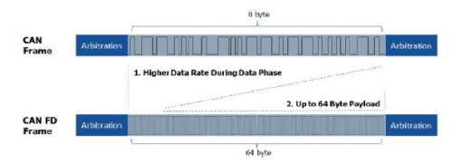 車載以太網雖然可以解決數(shù)據(jù)量的問題,但其布線改變過大,成本上升過多,只適合于網關之間的通訊。所以CiA協(xié)議就聯(lián)合各大車廠,制定出新一代的CANFD協(xié)議,以快速升級現(xiàn)有的CAN2.0B。其主要的內容就是將一幀的數(shù)據(jù)段由8字節(jié)提升到64字節(jié),同時可以提升數(shù)據(jù)段的波特率,以縮短通訊時間。如圖1所示。