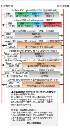 成熟的應用層協(xié)議都有可靠的分幀協(xié)議,比如CANopen,DeviceNET,J1939協(xié)議等,總的方針都是“握手”“傳輸”“確認”“結束”這四個過程循環(huán)。這里只介紹CANopen協(xié)議中的SDO多幀傳輸。