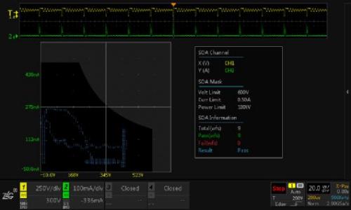 示波器的測試應(yīng)用非常簡單,使用電壓、電流探頭正常測試開關(guān)管的VDS和IDM,并打開SOA分析功能,對照數(shù)據(jù)手冊的SOA數(shù)據(jù)設(shè)置好示波器的SOA參數(shù)即可。一但波形觸碰到安全區(qū)以外的區(qū)域,就說明器件超額工作,存在危險。