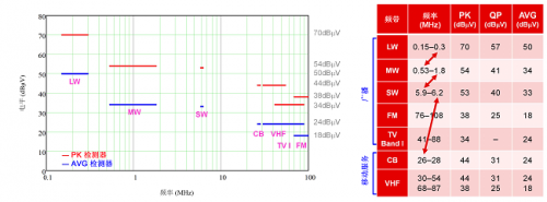 CISPR 25 測試的傳導發(fā)射均在 150kHz 至 108MHz 頻率范圍的特定頻帶內進行測量。具體而言,調節(jié)頻率范圍分布在 AM 廣播、FM 廣播和移動服務頻帶之間,如圖 2 中的圖象和表格所示。圖 2 還繪制了 CISPR 25 5 類(最嚴苛的要求)的相關限值圖象。盡管頻帶之間的帶隙允許更高的噪聲尖峰,但汽車制造商可能會根據(jù)其特定的內部 EMC 要求選擇擴展這些頻率范圍。這些要求通常基于國際 IEC 標準,僅更改不同測試或限值的少量參數(shù),其核心內容保持不變。