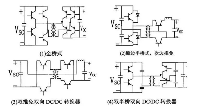 隔離型雙向DCDC,在非隔離型雙向DCDC轉(zhuǎn)換器的基礎(chǔ)上加上一個(gè)高頻變壓器就構(gòu)成了隔離型雙向DCDC轉(zhuǎn)換器,高頻變壓器兩側(cè)的電路拓?fù)淇梢允侨珮蚴健霕蚴健⑼仆焓降鹊取_@幾種隔離型的雙向DCDC轉(zhuǎn)換器,采用了更多的功率開(kāi)關(guān),電壓變比大,帶電氣隔離等優(yōu)點(diǎn)。但是這類DCDC轉(zhuǎn)換器結(jié)構(gòu)復(fù)雜,成本也相對(duì)較高,轉(zhuǎn)換器的損耗高,低頻時(shí)會(huì)導(dǎo)致隔離變壓器鐵芯飽和,損耗會(huì)進(jìn)一步增加。因此,非隔離型雙向DCDC轉(zhuǎn)換器比隔離型在電動(dòng)汽車(chē)上運(yùn)用更具有優(yōu)勢(shì)。