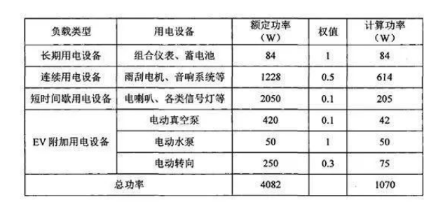 根據(jù)純電動(dòng)汽車(chē)車(chē)載電子設(shè)備的不同屬性,能把用電設(shè)備分為長(zhǎng)期用電、連續(xù)用電、短時(shí)間間歇用電和附加用電設(shè)備種類型,并賦于不同的權(quán)值。其中,長(zhǎng)期用電設(shè)備包括組合儀表和蓄電池,權(quán)值取1;連續(xù)用電設(shè)備包括雨刮、電機(jī)、音響系統(tǒng)和儀表照明等設(shè)備,權(quán)值可取0.5;短時(shí)間間歇用電設(shè)備包括電喇機(jī)、各類信號(hào)燈、控制器等設(shè)備,權(quán)值可取0.1;附加用電設(shè)備電動(dòng)真空泵、電動(dòng)水泵和電動(dòng)轉(zhuǎn)向,權(quán)值根據(jù)實(shí)際情況分別取0.1、1、0.3。各類設(shè)備所消耗功率分析如表所示。